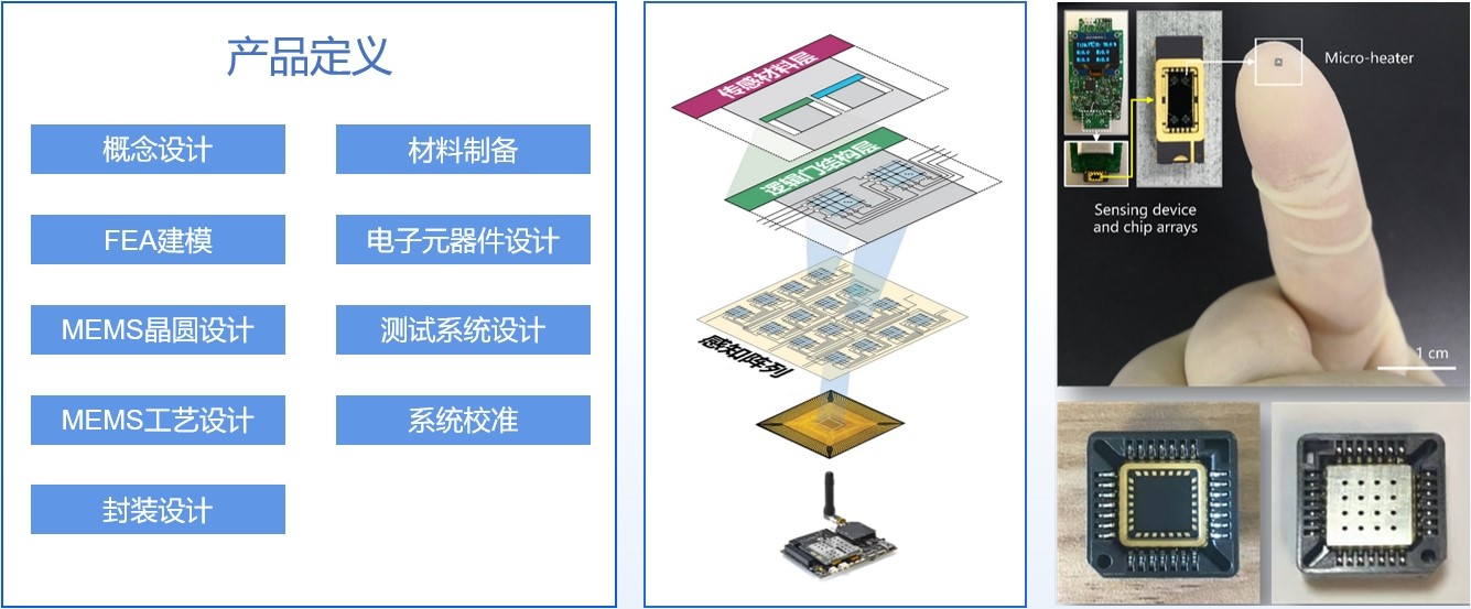 流片成功率:>40%;溫度測量精度:<1℃;加熱功耗:<50mW;升溫降溫迅速:≈200℃/秒;響應速度:<7s;靈敏度:<10mg/m3,無交叉敏感性;防護等級:IP65封裝;封裝尺寸:≤5×5cm。